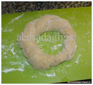 Fazer dois rolos e depois entrelaça-se os rolos e faz-se uma rosca.