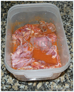 Umas horas antes tempere o coelho com sal o alho em pó ,a massa de pimentão caseira , o vinho branco e  deixe tomar gosto no frigorífico. .