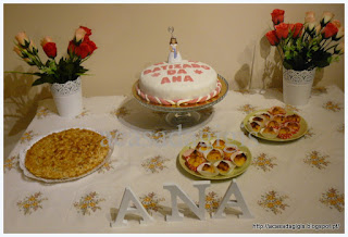 Num destes fim de semana , batizei a minha filha . O almoço e lanche foi feito cá em casa .Todo feito por mim e pelo marido com a ajuda da sogra:).  O bolo do batizado resolvi  fazer com cobertura de pasta portuguesa.
