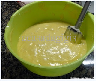 Coloque todos os ingredientes ,à excepção da farinha e do fermento, no liquidificador e triture durante 1 minuto ( em alternativa pode usar a varinha mágica ou até uma batedeira).