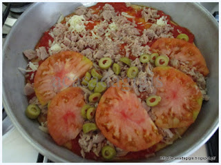 Coloque o molho de tomate por toda a pizza , um pouco de queijo , o atum escorrido , o tomate em rodelas , por cima do tomate coloque sal refinado.