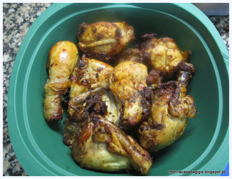 Tenho da tupperware um produto que se chama " Fech´Envolva " , gosto muito para marinar carne , fecha-se bem , vira-se bem e abana-se e os ingredientes ficam bem misturados. Desta vez foi umas pernas de frango que temperei e assei na actifry 2 em 1. Servi com batatas fritas também fritas na actifry 2 em 1 e o esparregado feito na Yammi 2. Receita: