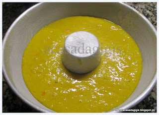 Coloque numa forma de coroa untada com manteiga e farinha (ou numa forma de silicone passada por água fria) e leve ao forno 30 minutos.